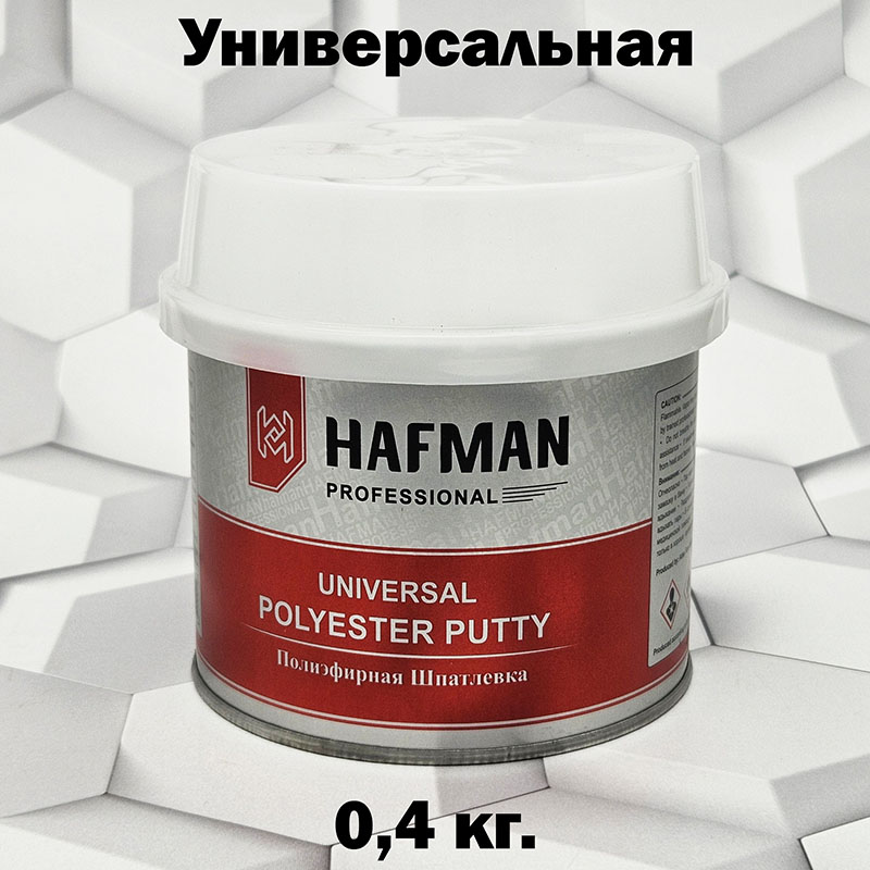 HAFMAN POLYESTER PUTTY 0,4кг. - универсальная полиэфирная шпаклевка с отвердителем предназначена для выравнивания поверхностей из металла, дерева, жёсткого пластика, стекла, бетона.
